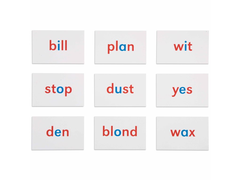 85 cards printed with red consonants and blue vowels for beginning phonetic reading. One phonetic word isolated on each card.Additional parameters